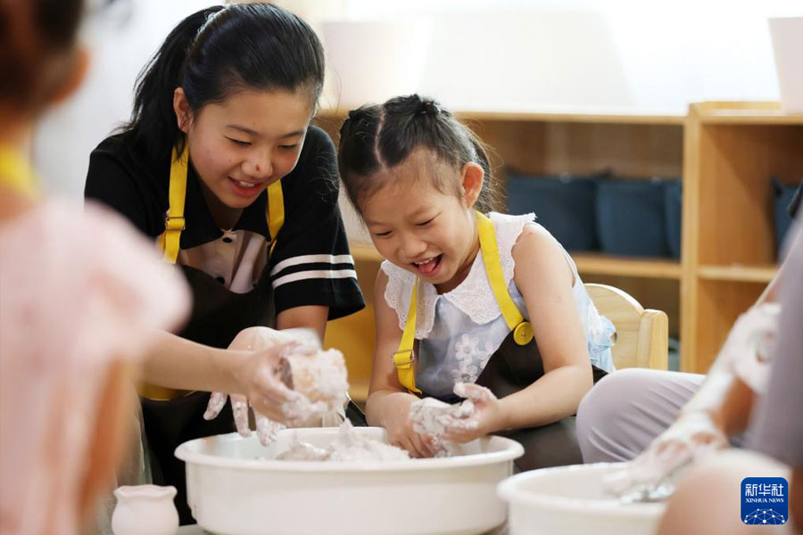 1/08月3日,在山東省臨沂市郯城縣郯城街道龍泉社區(qū)黨群服務(wù)中心,孩子們在體驗陶藝制作。(新華社發(fā) 張春雷/攝)