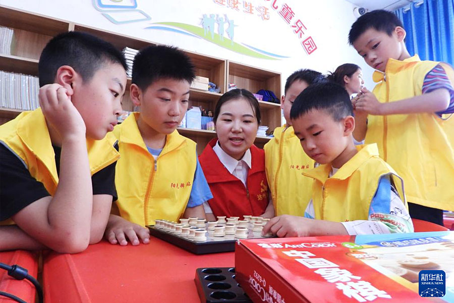 1/08月3日,在四川省達(dá)州市萬源市石塘鎮(zhèn)前進(jìn)社區(qū)“陽光驛站”,志愿者在輔導(dǎo)留守兒童下象棋。(新華社發(fā) 鄧良奎/攝)