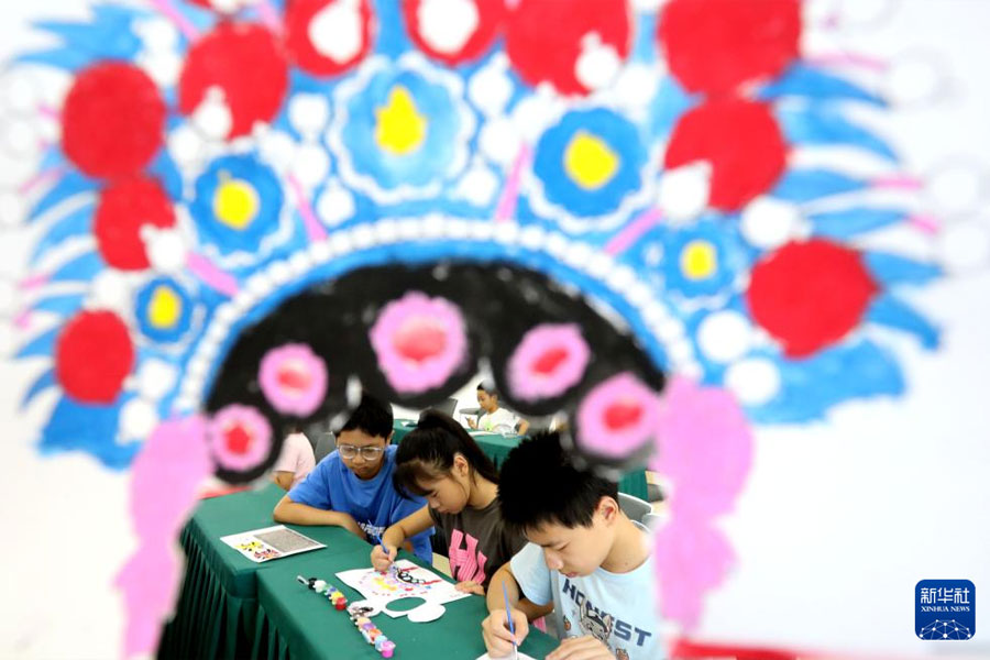 1/08月1日,在江蘇省蘇州市姑蘇區(qū)三元一村社區(qū),小朋友在體驗?zāi)樧V剪貼畫制作。(新華社發(fā) 杭興微/攝)