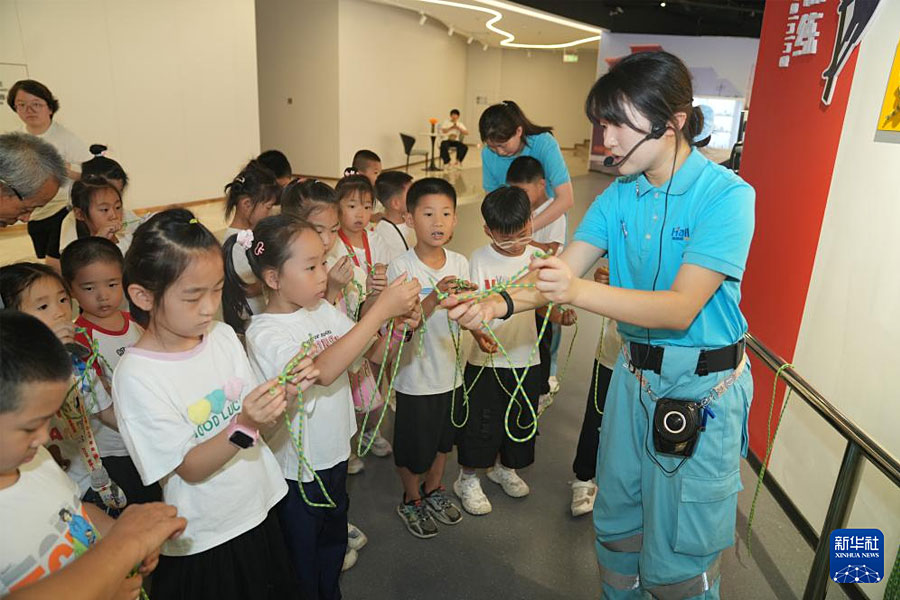 1/08月1日,在山東省青島市李滄區(qū)全生命周期安全體驗館,孩子們在工作人員的指導(dǎo)下學(xué)習(xí)打繩結(jié)。(新華社發(fā) 張鷹/攝)