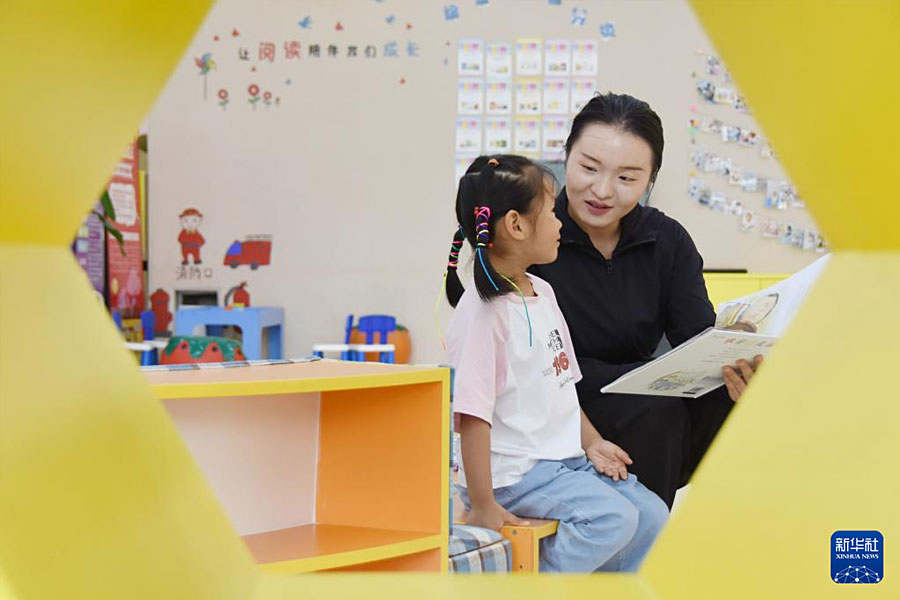 1/08月3日,在云南省紅河哈尼族彝族自治州蒙自市的紅河州青少年宮兒童圖書館,工作人員在給小朋友講解兒童讀物。(新華社發(fā) 薛瑩瑩/攝)