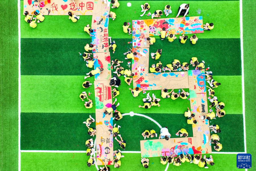 1/09月26日,江西省宜春市銅鼓縣幼兒園的孩子們?cè)诓賵?chǎng)上創(chuàng)作國(guó)慶主題繪畫(huà)作品(無(wú)人機(jī)照片)。(新華社發(fā) 周亮/攝)