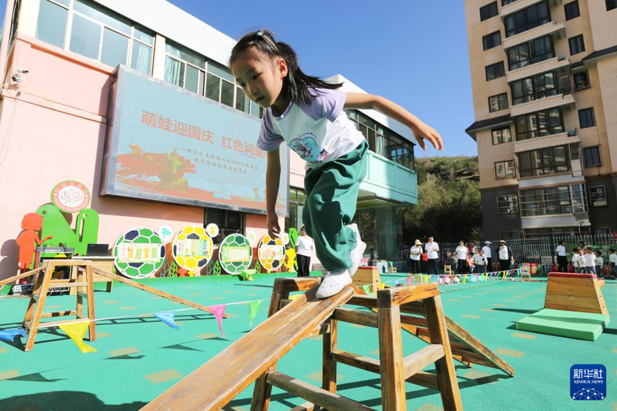 1/09月26日,甘肅省定西市安定區(qū)南苑幼兒園的小朋友在進(jìn)行趣味游戲。(新華社發(fā) 王克賢/攝)