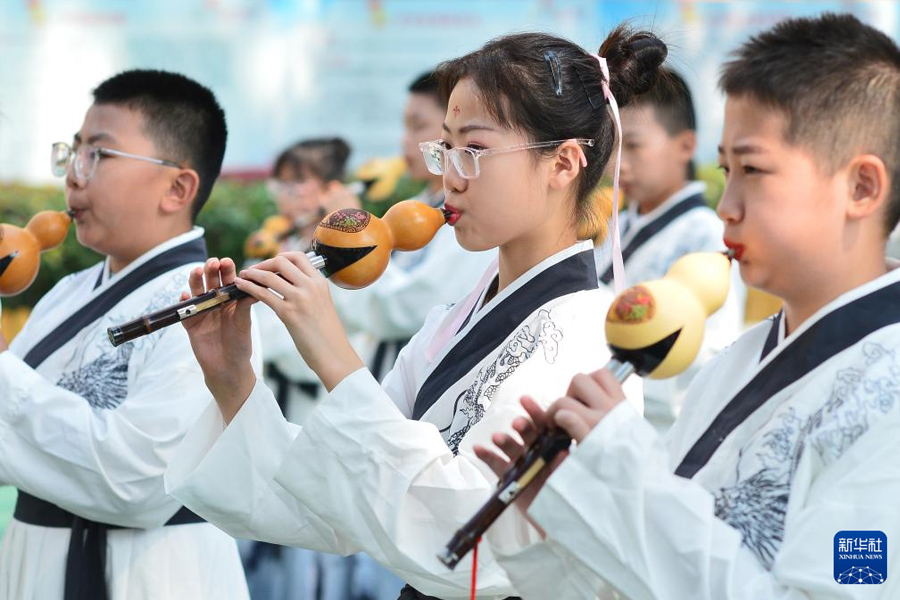1/09月26日,在山東青島陵縣路小學(xué)開(kāi)展的國(guó)慶主題活動(dòng)上,小學(xué)生在表演葫蘆絲。(新華社發(fā) 王海濱/攝)