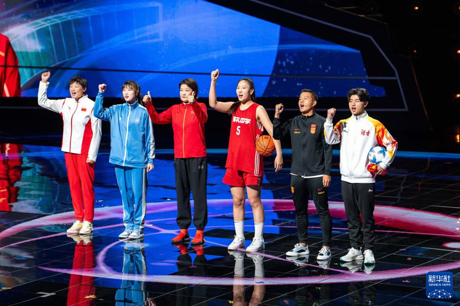 1/011月20日,前中國女排運(yùn)動(dòng)員楊昊(左一)、前中國女籃運(yùn)動(dòng)員宋曉波(左三)、前中國男足運(yùn)動(dòng)員黃博文(右二)和三名參賽運(yùn)動(dòng)員在開幕式上。(新華社記者 陳思汗/攝)