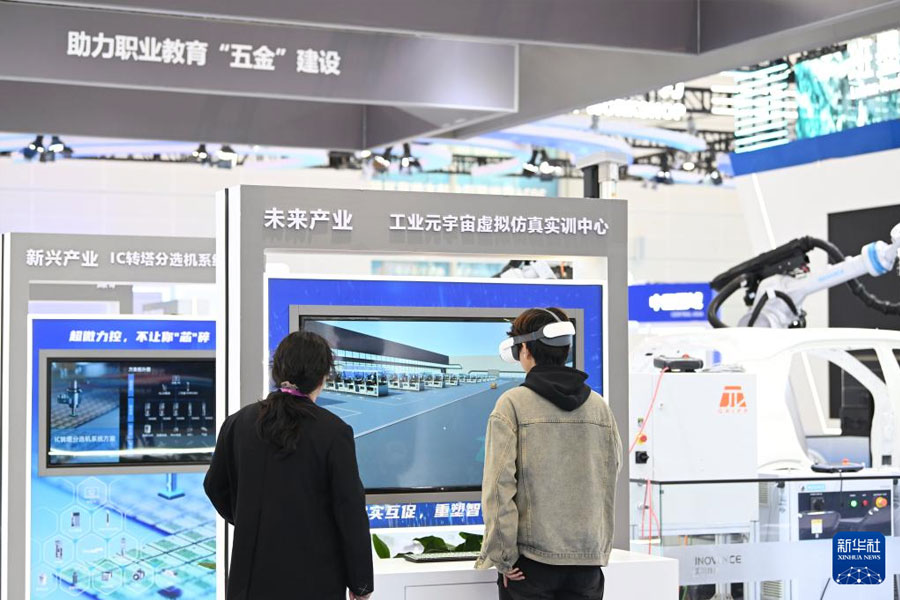 1/011月21日,參會(huì)者在職業(yè)教育專題展上體驗(yàn)未來(lái)產(chǎn)業(yè)仿真實(shí)訓(xùn)中心。(新華社記者 李然/攝)