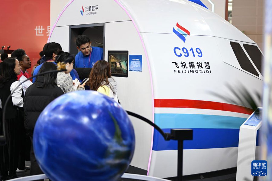 1/011月21日,參會(huì)者在職業(yè)教育專題展上參觀C919飛機(jī)模擬器。(新華社記者 李然/攝)