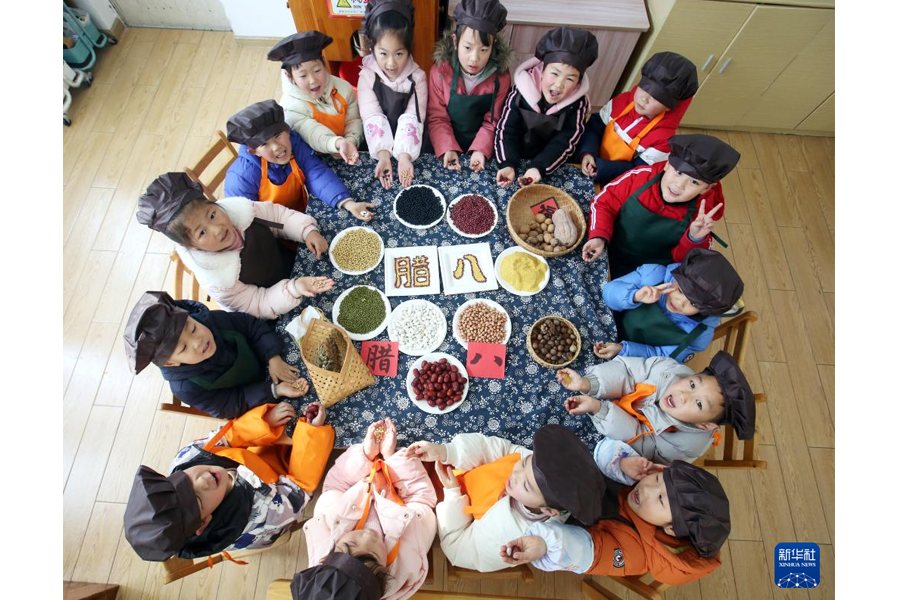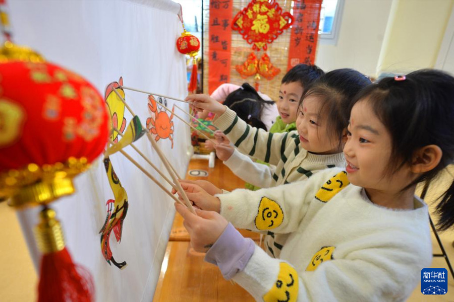 1/012月26日,在山東省青島市市北區(qū)第七實驗幼兒園,小朋友們在表演皮影戲。(新華社發(fā) 王海濱/攝)