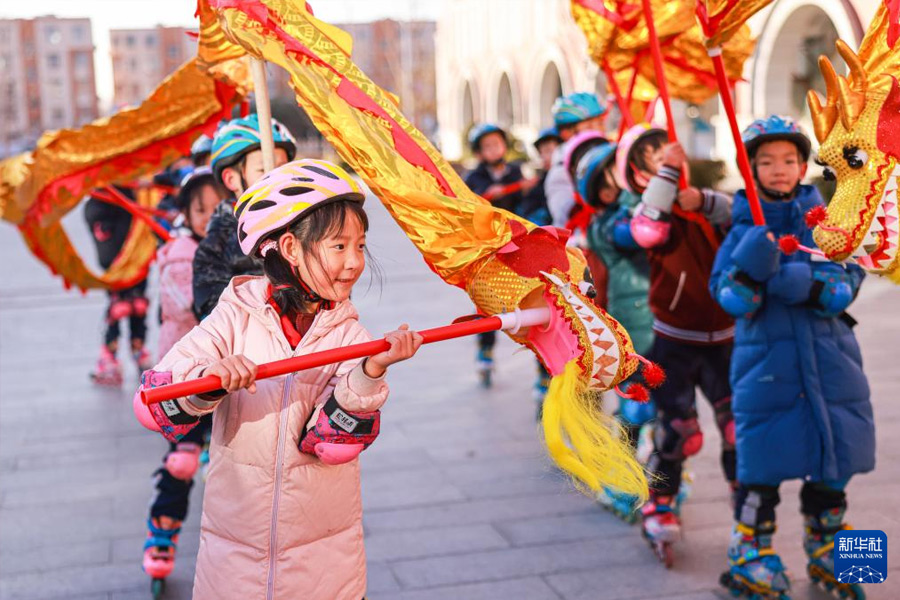 1/012月26日,在山東省榮成市實驗小學(xué)校園內(nèi),孩子們練習(xí)輪滑舞龍,為迎新年文藝匯演做準(zhǔn)備。(新華社發(fā) 李信君/攝)