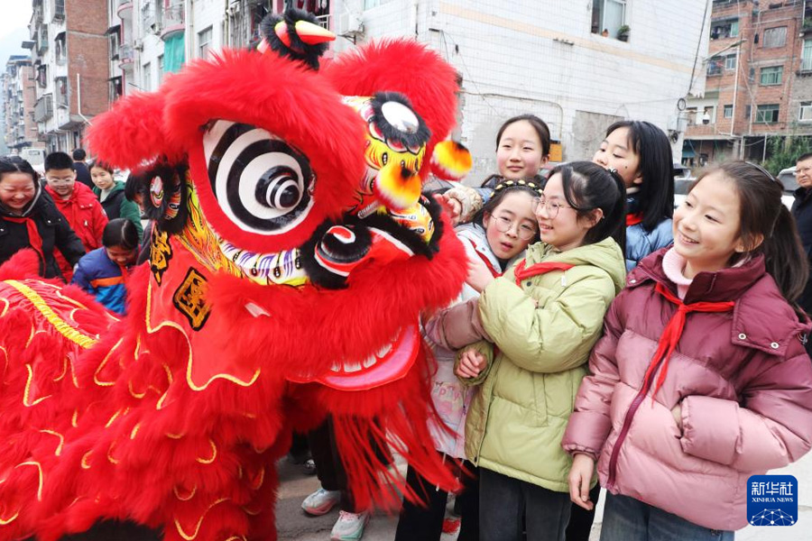 1/012月26日,在四川省宣漢縣黃金鎮(zhèn)中心校,宣漢縣黃金獅舞團(tuán)為學(xué)生們表演舞獅。(新華社發(fā) 鄧良奎/攝)