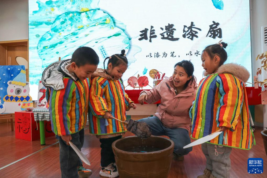 1/012月26日,在江蘇省揚州市江都區(qū)育才幼兒園,漆扇制作師指導(dǎo)小朋友制作漆扇。(新華社發(fā) 任飛/攝)