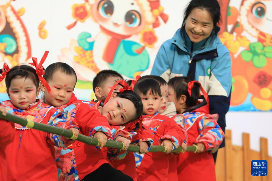 1/012月26日,四川省廣安市武勝縣迎賓幼兒園的小朋友體驗“跳竹竿”。(新華社發(fā) 夏俊林/攝)