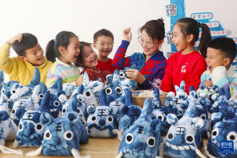 1/012月26日,在山東省高密市鳳鳴實驗幼兒園舉行的“學(xué)非遺 迎新年”活動中,老師利用自制的藍(lán)染布料縫制新年禮物。(新華社發(fā) 李海濤/攝)