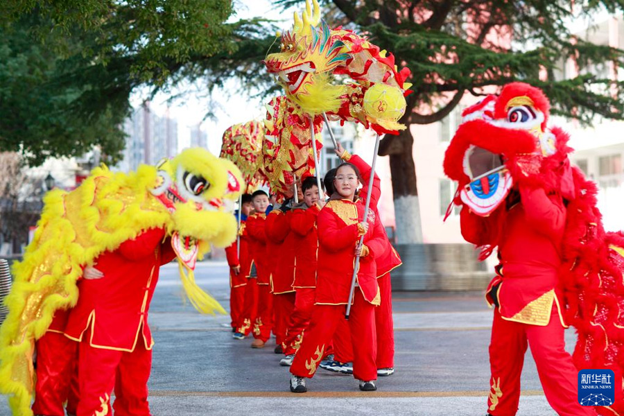 1/012月26日,在江蘇省興化市新生中心小學(xué),孩子們在老師的指導(dǎo)下體驗舞龍舞獅。(新華社發(fā) 周社根/攝)