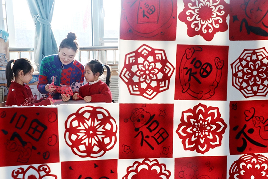 1/012月26日,在山東省高密市鳳鳴實驗幼兒園舉行的“學(xué)非遺 迎新年”活動中,老師與孩子們一起剪窗花裝飾教室。(新華社發(fā) 李海濤/攝)