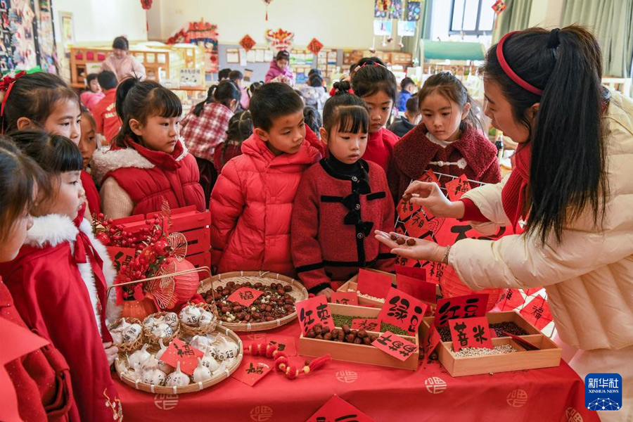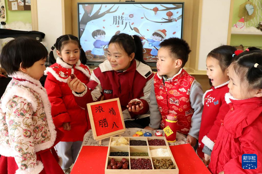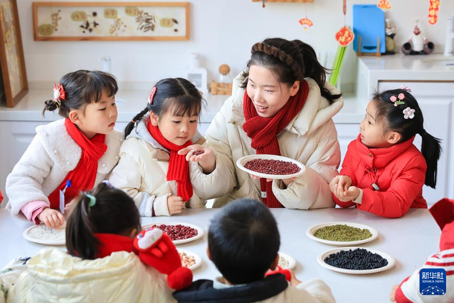 1/01月6日,在河南省焦作市博愛縣實驗幼兒園里,教師教小朋友識別制作臘八粥的食材。(新華社發(fā) 程全/攝)