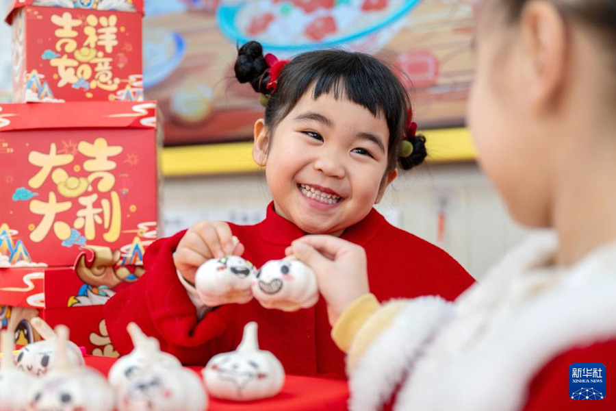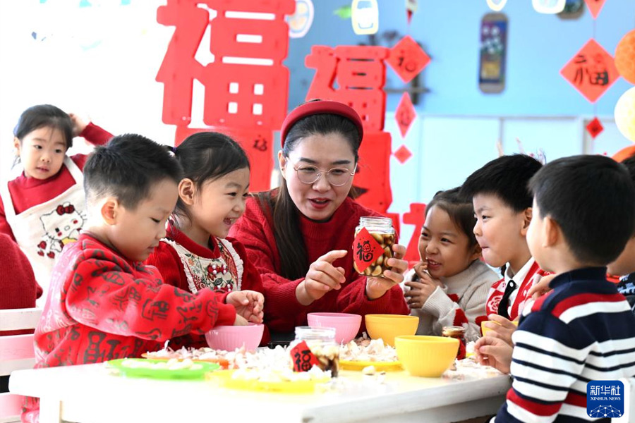 1/01月6日,在山東省濱州市一家幼兒園,孩子們體驗腌制臘八蒜。(新華社發(fā) 賈海寧/攝)