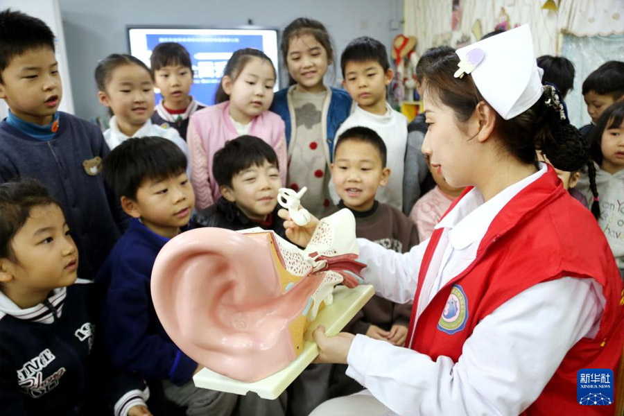 1/02月28日,江蘇省連云港市東方醫(yī)院的醫(yī)務(wù)人員給連云港市核電鐘聲幼兒園小朋友講解耳朵的構(gòu)造及護(hù)耳知識。(新華社發(fā) 王春/攝)