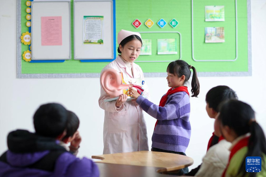 1/03月2日,醫(yī)務(wù)人員在江蘇省興化市昌榮鎮(zhèn)陳唐村新時代文明實(shí)踐站給學(xué)生講解耳朵的構(gòu)造及護(hù)耳知識。(新華社發(fā) 周社根/攝)