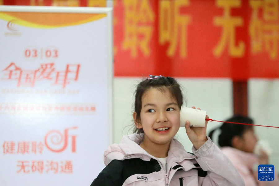 1/03月2日,在江蘇省揚(yáng)州市徐凝門街社區(qū),一名小朋友在感受音量對聽力產(chǎn)生的影響。(新華社發(fā) 孟德龍/攝)