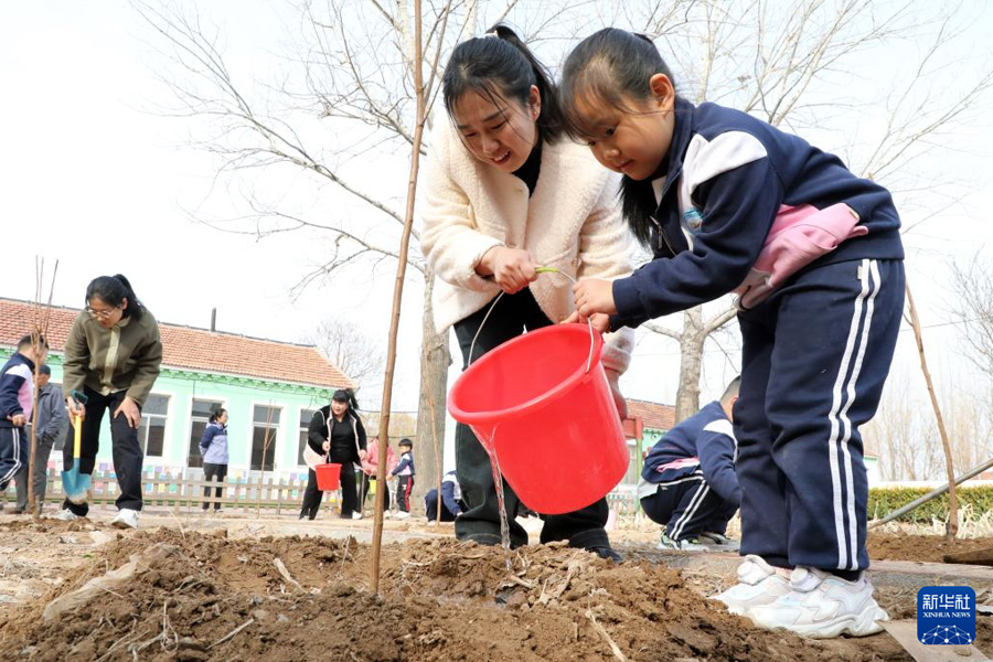 3月10日,在山東省濱州市博興縣城東街道中心幼兒園,小朋友和家長一起給剛剛種植的樹苗澆水。(新華社發(fā) 陳彬/攝)
