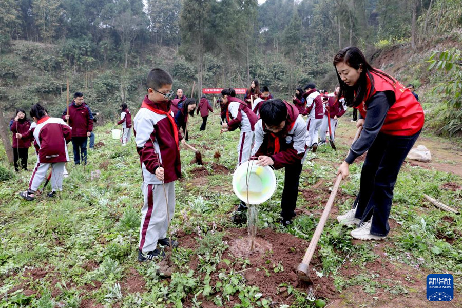 3月10日,四川省廣安市廣安區(qū)富源小學的少先隊員和志愿者一起栽植樹苗。(新華社發(fā) 廖小兵/攝)