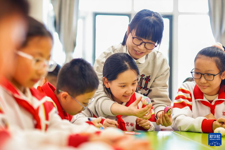 1/03月20日,天津市濱海新區(qū)塘沽實(shí)驗(yàn)小學(xué)的學(xué)生們繪彩蛋,了解春分節(jié)氣習(xí)俗。(新華社發(fā) 杜鵬輝/攝)