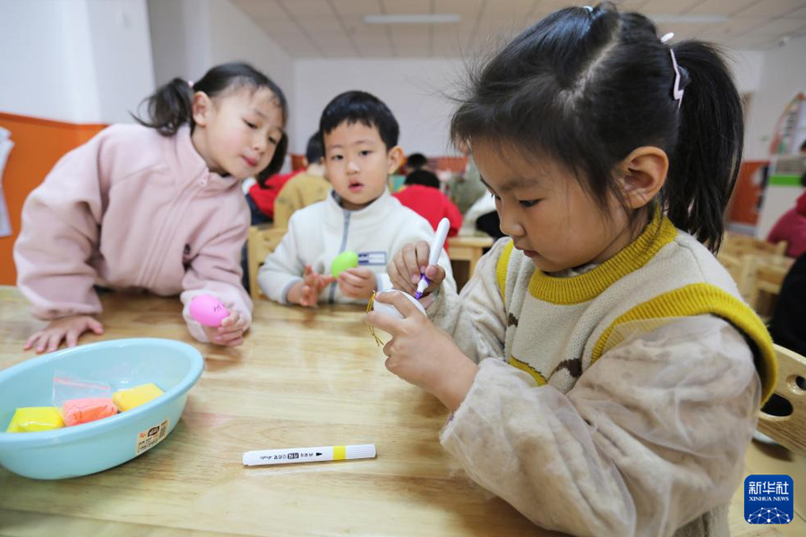 1/03月20日,甘肅省定西市安定區(qū)實(shí)驗(yàn)幼兒園的小朋友在繪彩蛋。(新華社發(fā) 王克賢/攝)