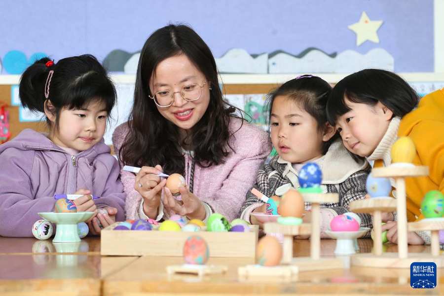 1/03月20日,在江蘇省句容市郭莊鎮(zhèn)葛村中心幼兒園,老師指導(dǎo)小朋友繪制彩蛋。(新華社發(fā) 鐘學(xué)滿/攝)