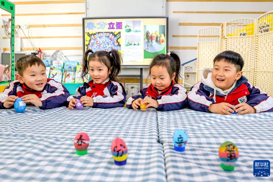 1/03月20日,在江蘇省揚(yáng)州市江都區(qū)育才幼兒園,小朋友們體驗(yàn)“立蛋”習(xí)俗。(新華社發(fā) 任飛/攝)