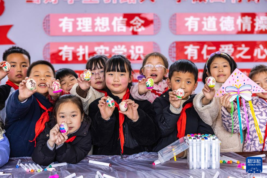 1/03月20日,在貴州省安順市第八小學(xué),學(xué)生展示繪制的彩蛋。(新華社發(fā) 陳熙/攝)