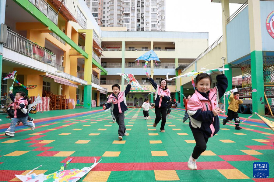 1/03月20日,貴州省黔南布依族苗族自治州都勻市第六幼兒園的老師和小朋友在放風(fēng)箏。(新華社發(fā) 肖偉/攝)