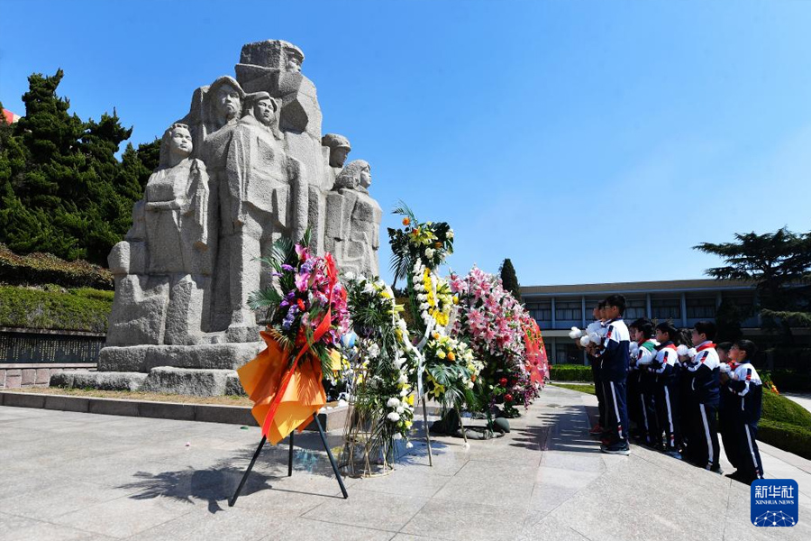 1/04月2日,山東省青島市市北區(qū)普新小學(xué)學(xué)生在革命烈士雕塑前獻(xiàn)花致敬。(新華社發(fā) 王海濱/攝)