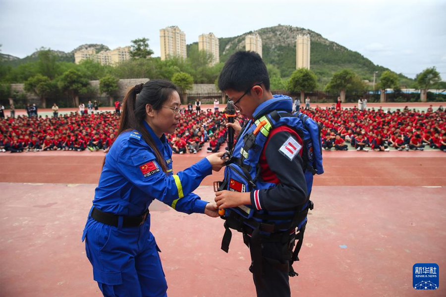 5月9日,在山東省濟南市泉海小學,藍天救援隊志愿者給學生講解、演示救援服穿法。5月12日是第17個全國防災減災日。近日來,各地開展形式多樣的防災減災宣傳教育及演練培訓活動,提高人們科學防災意識和災害避險自救能力。(新華社發(fā) 郝鑫城/攝)