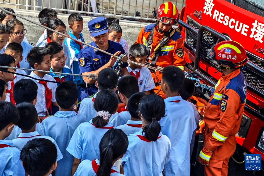 5月9日,在云南省普洱市景谷縣森林消防中隊,消防員向學生講解滑輪在救援中的運用。(新華社發(fā) 郭元首/攝)