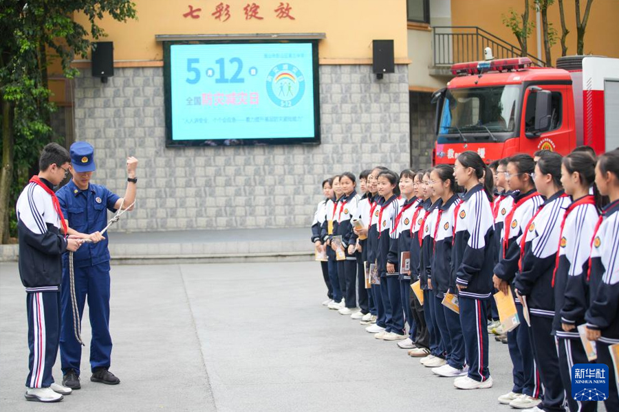 5月9日,消防救援人員給四川省眉山市彭山區(qū)第三中學的學生講解安全繩知識。(新華社發(fā) 翁光建/攝)