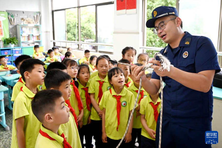 5月9日,浙江省武義縣消防大隊救援人員為武義縣實驗小學學生講解逃生繩的使用方法。(新華社發(fā) 張建成/攝)