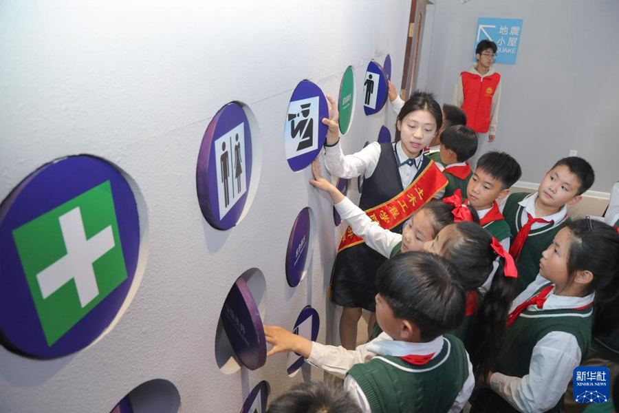 5月8日,江蘇省徐州市瀟湘路學校的學生在防震減災教育科普基地學習避險標志。(新華社發(fā) 白雪/攝)