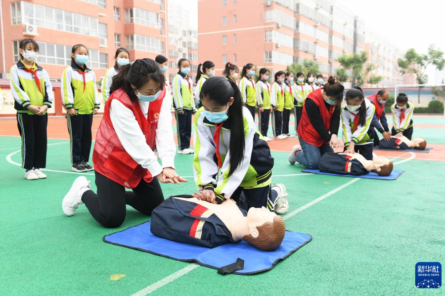 5月11日,在河北省石家莊新樂市民生街小學,志愿者向學生講解心肺復蘇急救知識。(新華社發(fā) 賈敏杰/攝)