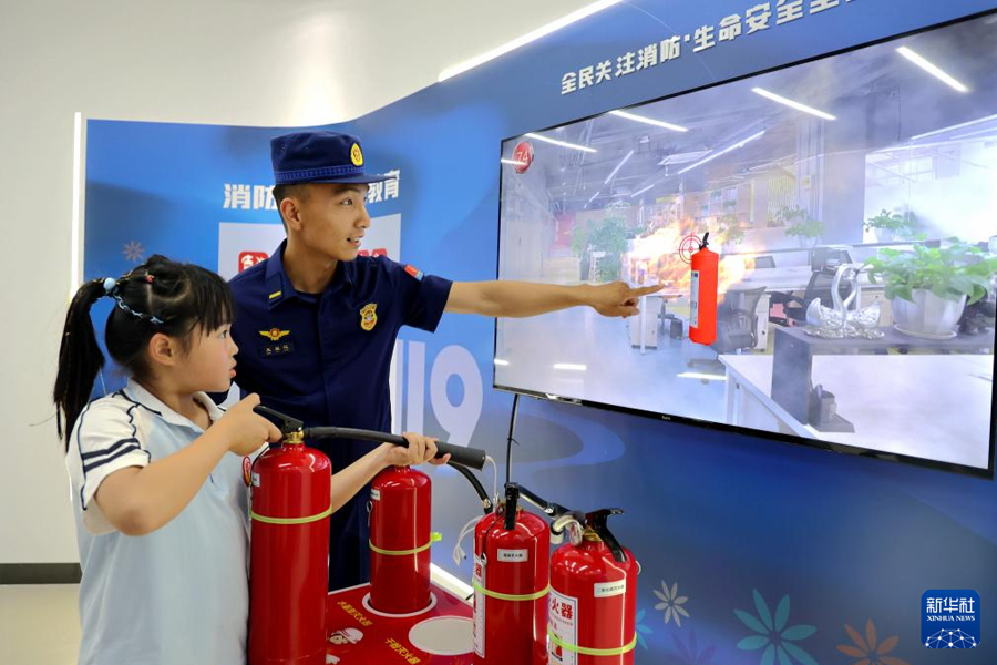 5月11日,在山東省濱州市陽信縣勞店鎮(zhèn)科普教育大廳,小朋友在消防救援隊員的指導下進行模擬滅火訓練。(新華社發(fā) 初寶瑞/攝)
