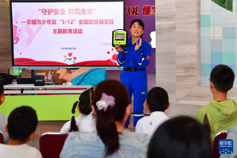 5月11日,在江蘇省無錫市少年宮,無錫藍天救援隊隊員為小朋友和家長講解AED急救設備使用方法。(新華社發(fā) 還月亮/攝)