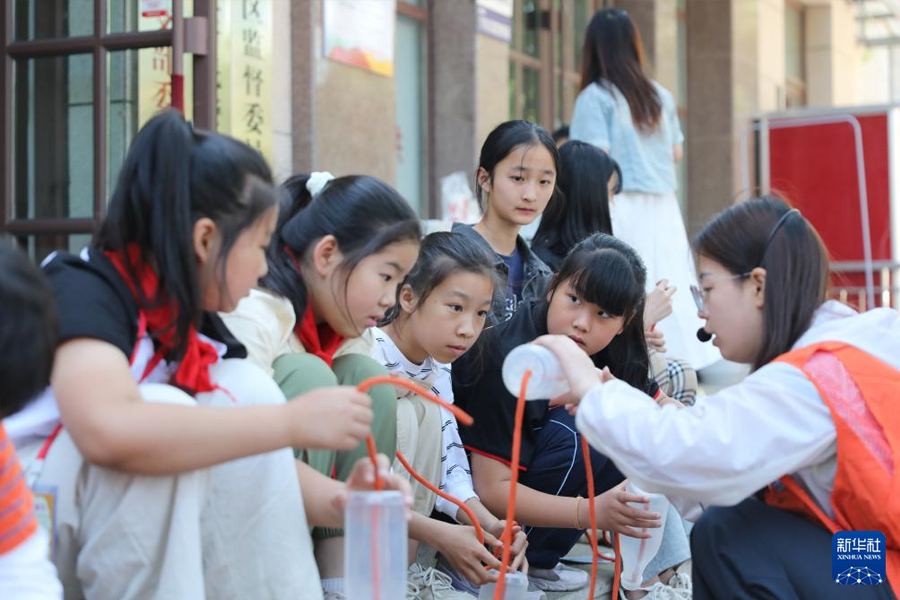 5月11日,學生在河南省焦作市溫縣岳村街道慈勝社區(qū)防災減災宣傳活動現(xiàn)場學習制作拋繩器。(新華社發(fā) 黃福興/攝)