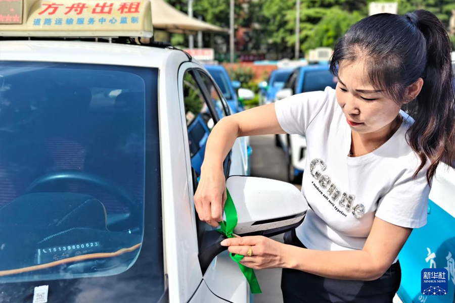 1/06月4日,河南省三門峽市啟動“任你乘風(fēng)破浪,保你追逐夢想”愛心送考公益活動。一名“愛心送考”車隊的女司機將象征“平安、快捷”的綠色絲帶系在車上。(新華社發(fā) 杜杰/攝)