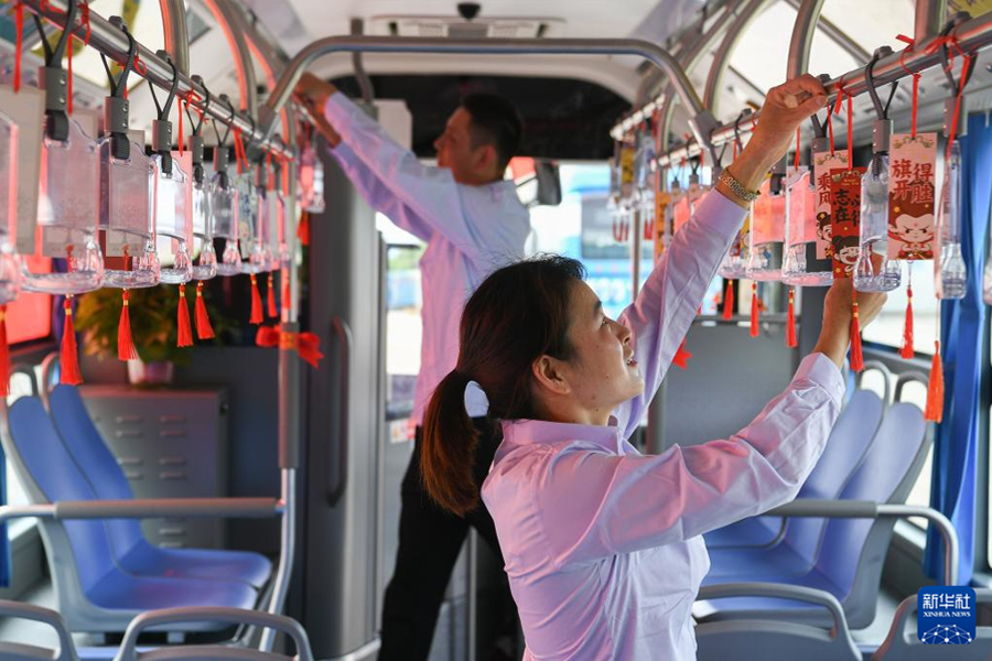 1/06月5日,在浙江省金華市交投公交集團客運金西公司,工作人員在高考送考公交車廂里掛祝??ㄆ?。(新華社發(fā) 時寬兵/攝)