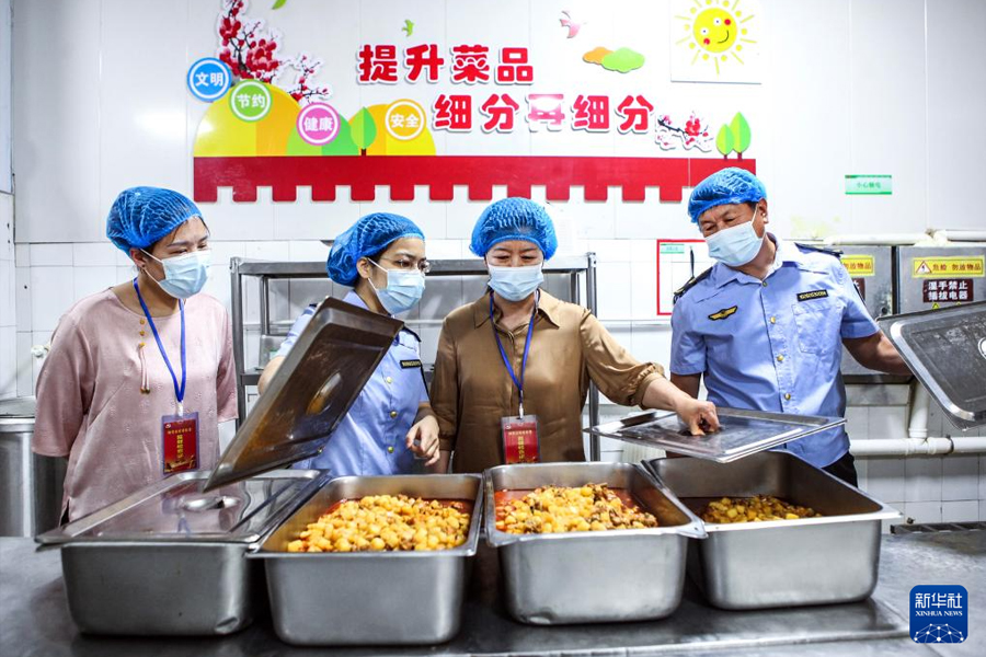 1/06月5日,在河南省焦作市博愛縣第一中學(xué),縣紀(jì)委監(jiān)委工作人員聯(lián)合市場監(jiān)管部門對考點食堂開展食品安全專項監(jiān)督檢查。(新華社發(fā) 程全/攝)