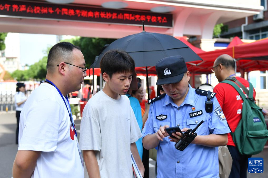 1/06月7日,在湖南省長(zhǎng)沙麓山國(guó)際實(shí)驗(yàn)學(xué)??键c(diǎn)外,民警為遺落身份證的考生辦理手續(xù)。(新華社記者 陳振海/攝)