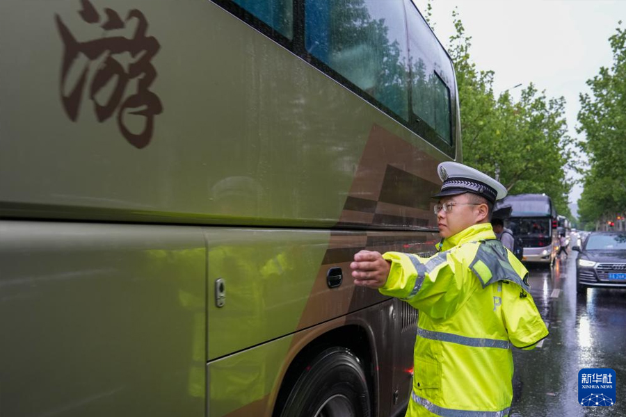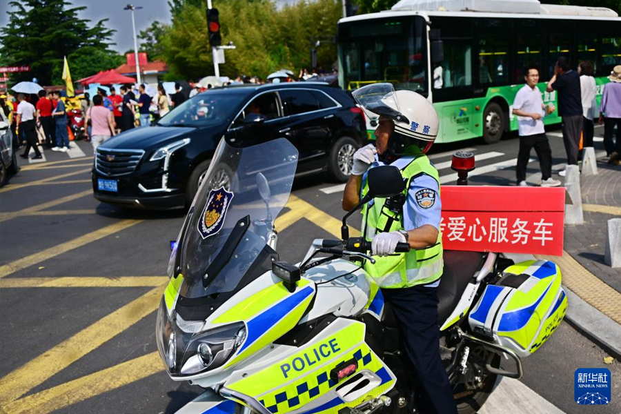 1/06月7日,在南京市建鄴區(qū)中華中學(xué)考點(diǎn)外,南京交警四大隊(duì)的交通警察在指揮交通。(新華社記者 李博/攝)