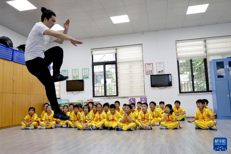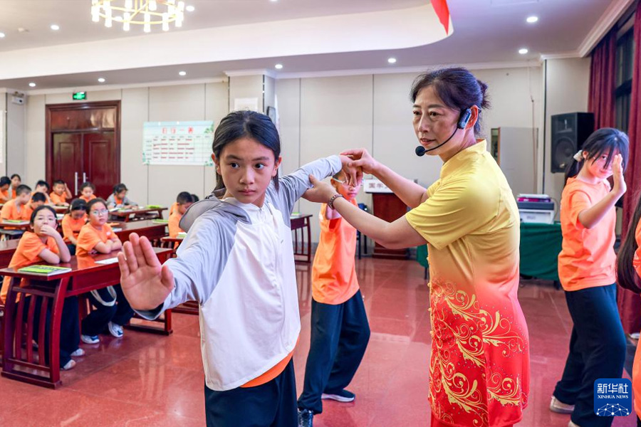 1/07月12日,在江蘇省揚州市江都區(qū)婦聯(lián)舉辦的公益國學(xué)夏令營活動中,武術(shù)教練指導(dǎo)兒童練習(xí)五步拳。(新華社發(fā) 任飛/攝)