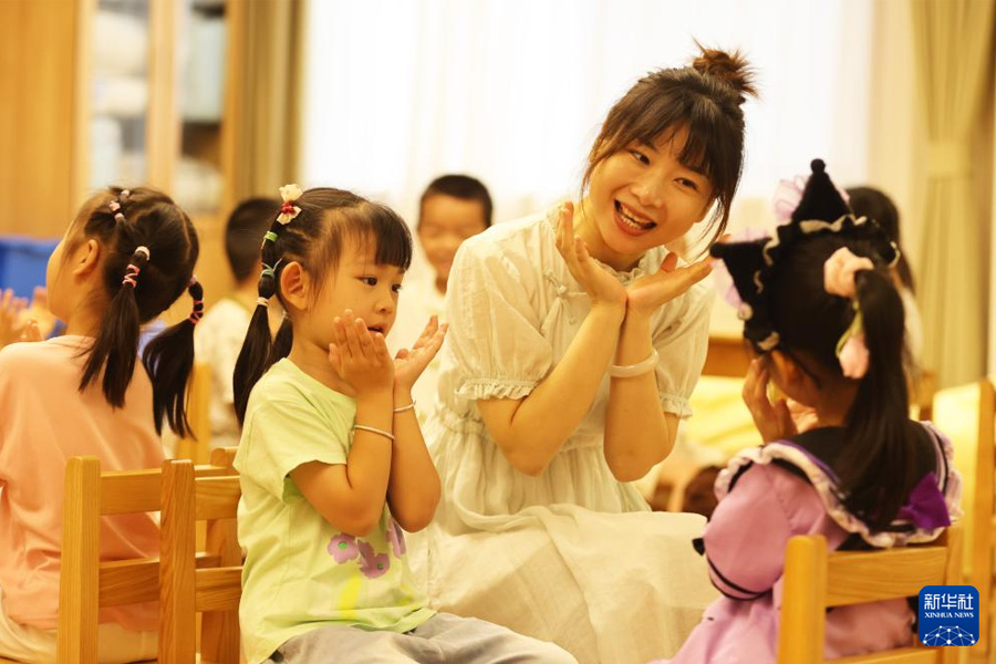 1/07月12日,在浙江省湖州市德清縣乾元鎮(zhèn)的青少年宮,孩子在老師引導(dǎo)下玩拍花籮游戲。(新華社發(fā) 倪立芳/攝)