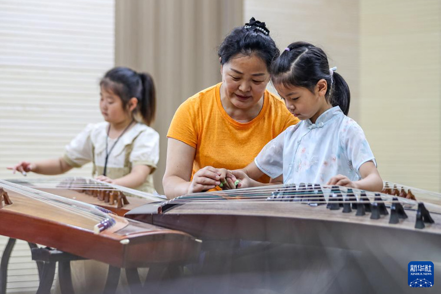 1/07月12日,在江蘇省句容市文化館,小朋友在老師的指導(dǎo)下學(xué)習(xí)古箏彈奏。(新華社發(fā) 鐘學(xué)滿/攝)